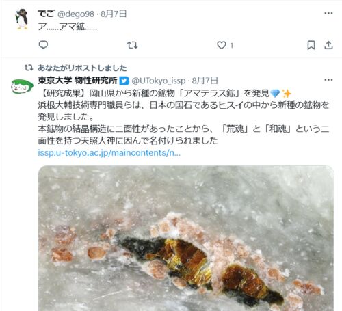 新種の鉱物がアマテラス鉱石と名付けられた! 【研究成果】岡山県から新種の鉱物「アマテラス鉱」を発見✨浜根大輔技術専門職員らは、日本の国石であるヒスイの中から新種の鉱物を発見しました。本鉱物の結晶構造に二面性があったことから、「荒魂」と「和魂…