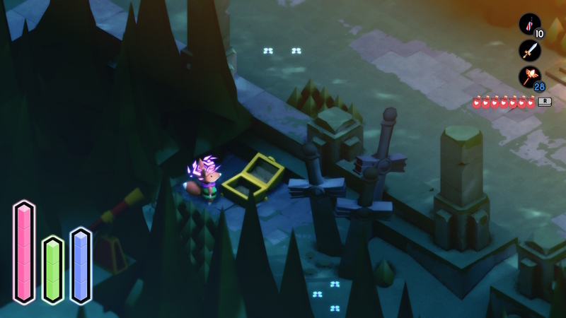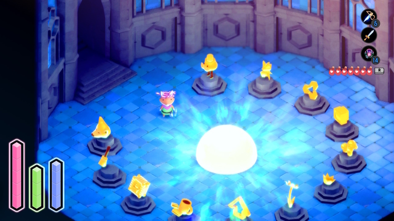 わからないなりに、「次何したらいいのか」はわかるので、冒険を進めていく。手に入るアイテム、進むための謎解きギミック、襲いかかる敵、説明書で知る新しいテクニック…などなど。徐々にできることが増えていき、行くべきところが広がっていく冒険が、シンプルにおもしろい。説明書を拾っていくことで「こんなこともできるのか」「ここも行けるのか」と知っていくおもしろさ。